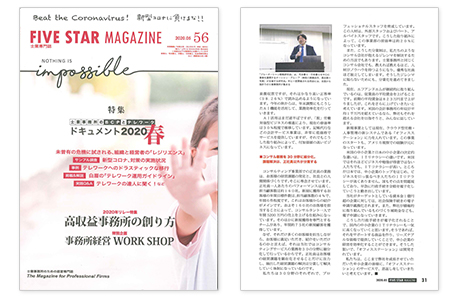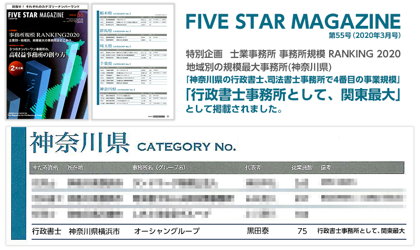 「FIVE STAR MAGAZINE」第55号(2020年3月号)の特別企画「士業事務所 事務所規模 RANKING 2020」地域別の規模最大事務所(神奈川県)に、オーシャングループが「神奈川県の行政書士、司法書士事務所で4番目の事業規模」「行政書士事務所として、関東最大」として掲載されました。