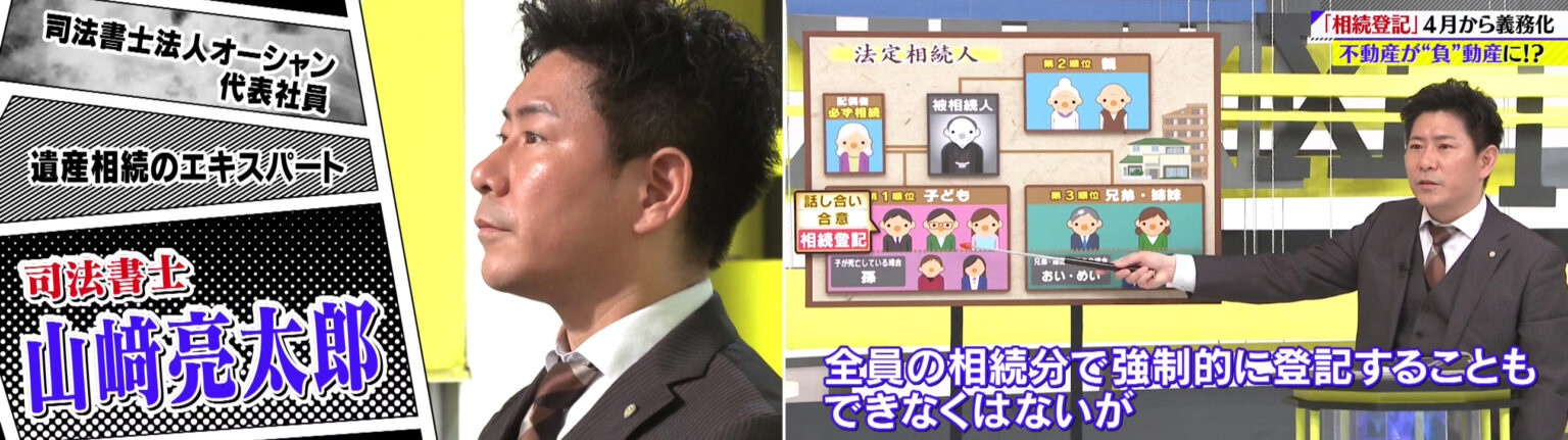 2024年2月28日(水)21時~放送のテレビ東京「60秒で学べるNews」に、当グループの司法書士法人オーシャンの代表司法書士山﨑が出演し、相続登記の義務化について解説をいたしました。