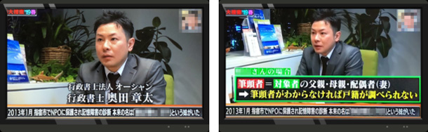 2019年2月7日(水)放送のTBS「緊急!公開大捜索’19春」において、記憶をなくされた方の戸籍謄本等の取得について、当グループ行政書士法人オーシャンの行政書士奥田が取材を受けました。