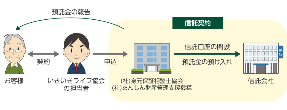 いきいきライフ協会®では、預託金と専門家への報酬をはっきりと区別し、預託金は倒産隔離機能のある信託口座でお預かりしています。原則としてご契約者様がお亡くなりになるまでロックされるため、知らないうちに使い込まれるといった心配はご不要です。