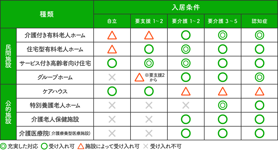 - 介護型…一般型の支援のほか、介護サービスが利用可能な施設。入居条件は65歳以上かつ要介護1以上の高齢者であること